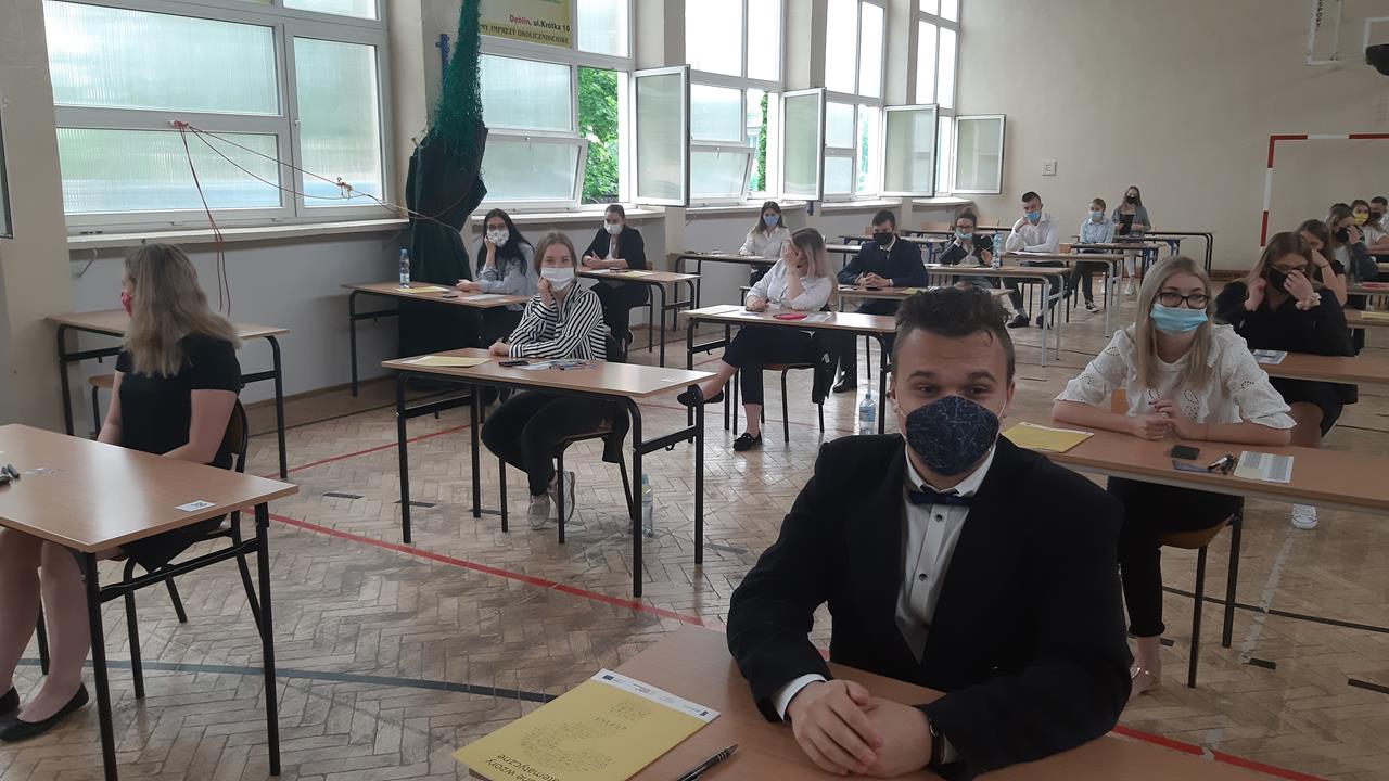 Maturzyści w maseczkach wchodzą do szkoły trzema wejściami, zachowując 1,5- metrowy odstęp między sobą. Każdy absolwent jest także zobowiązany do używania własnych przyborów pisemnych, tak aby ich nie pożyczać sobie nawzajem.