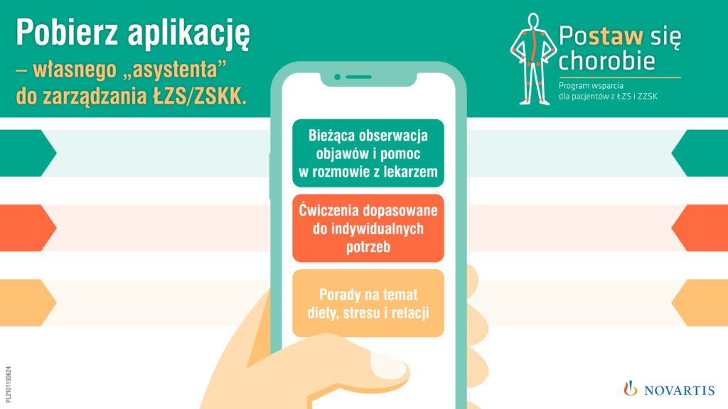 Dieta ograniczająca spożywanie produktów prozapalnych, aktywność fizyczna, fizjoterapia oraz rehabilitacja są niezbędnym elementem terapii wpływającym na poprawę mobilności, funkcjonowania oraz ogólnego zdrowia osób chorych na spondyloartropatie. Stąd pomysł stworzenia aplikacji na telefon „Postawsiechorobie”, dzięki której pacjent będzie miał dostęp do wszystkich niezbędnych informacji o ŁZS i ZZSK, ich leczeniu oraz codziennym funkcjonowaniu. Z pomocą dietetyka, fizjoterapeuty, psychoterapeuty i seksuologa zostały opracowane wskazówki, jak radzić sobie z chorobą. Ważnym elementem aplikacji jest dzienniczek samoobserwacji. Oczywiście, decyzje dotyczące leczenia muszą być podejmowane przez lekarza, ale na podstawie indywidualnych potrzeb i stanu choroby pacjenta – dzienniczek obserwacji oparty na tych samych kalkulatorach, z których korzystają lekarze, znacząco ułatwia proces decyzyjny. Jest to jedyna taka aplikacja dostępna dla pacjentów z ŁZS i ZZSK – do pobrania z Google Play i appStore.