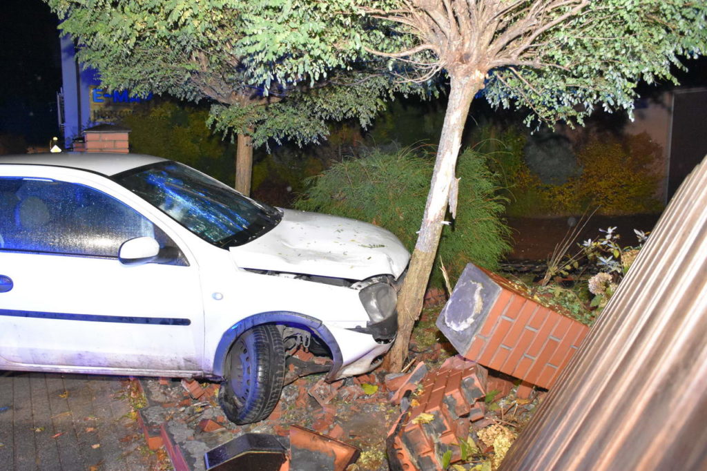 Z informacji uzyskanych na miejscu zdarzenia wynika, że kierujący oplem jadąc ulicą Grunwaldzką przejechał przez skrzyżowanie z ulicą Okólną i uderzył w ogrodzenie posesji znajdującej się naprzeciwko. W wyniku zderzenia murowane ogrodzenie oraz samochód zostały poważnie uszkodzone.