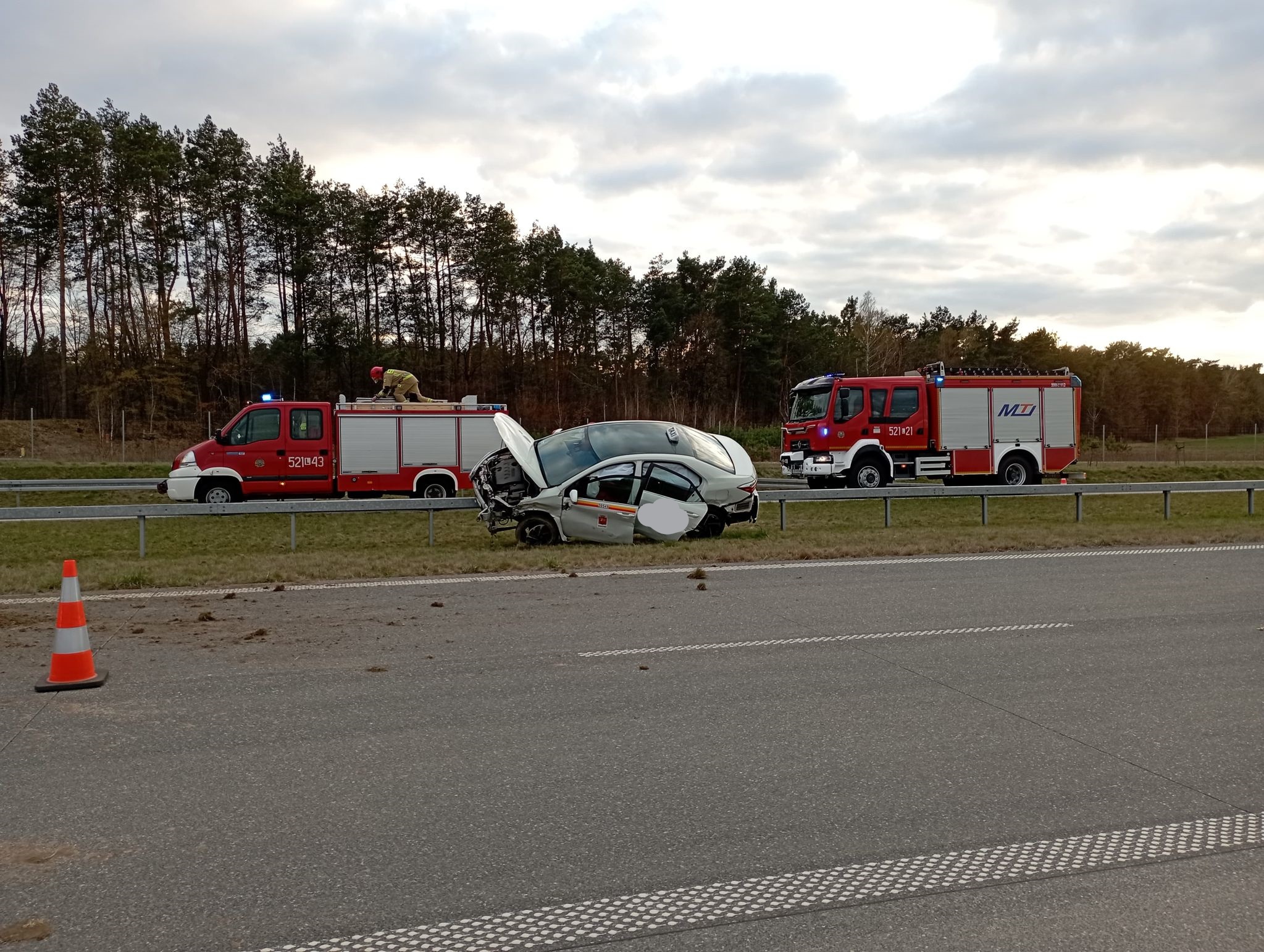 Po 18:00 na wysokości MOP Sarny na pasie w kierunku Warszawy samochód osobowy uderzył w barierę energochłonną.