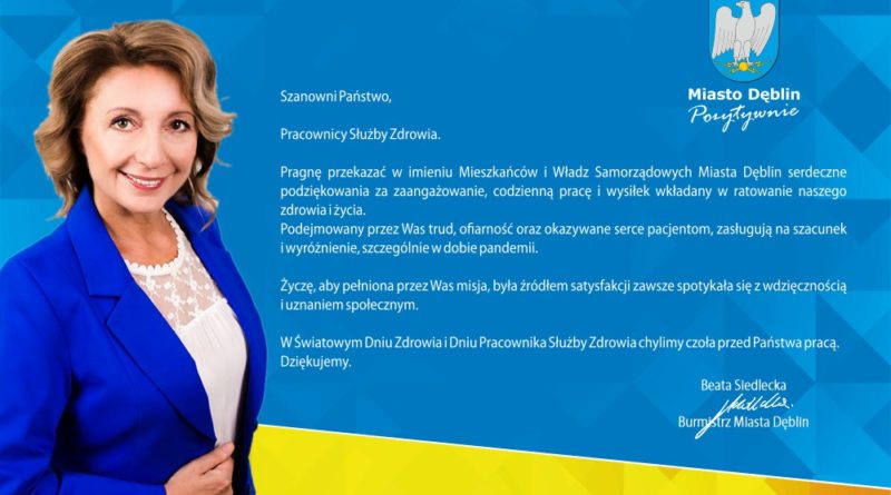 Szanowni Państwo, Pracownicy Służby Zdrowia. Pragnę przekazać w imieniu Mieszkańców i Władz Samorządowych Miasta Dęblin serdeczne podziękowania za zaangażowanie,