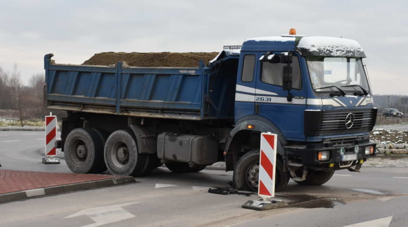 Na jednym z pasów stoi uszkodzona ciężarówka. Na rondzie Nauczycieli Tajnego Nauczania stoi zepsuta ciężarówka. Pojazd ma uszkodzoną przednią oponę.
