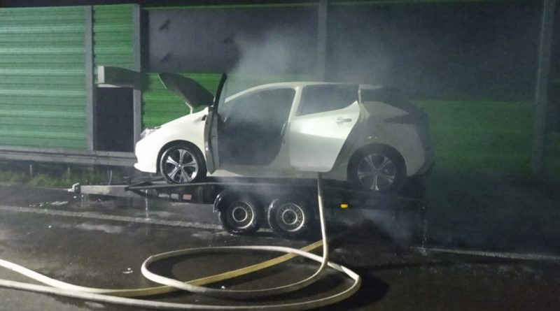 Dorohusk: 9 godzin gasili pożar auta elektrycznego przewożonego na lawecie
