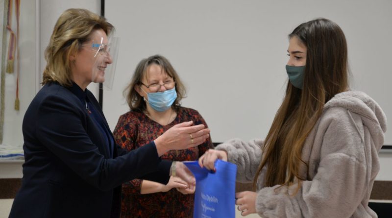Weronika Dąbrowska, Maria Kopeć oraz Michalina Jędrys, Oliwia Janiszek, Nikola Pataj, Martyna Lesisz, Bartosz Skóra na podium międzyszkolnego konkursu „Dęblin